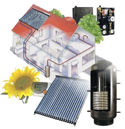 Instalatia solara prezentata este un sisstem termic pentru prepararea apei calde menajera si aport la incalzire. Ce inseamna aport la incalzire? Aportul la incalzire a unei instalatii solare inseamna contributia de energie termica la sistemul de incalzire a casei. Sistemul solar trebuie racordat la sistemul de incalzire al casei si v-a produce energia termica in functie de intensitatea soarelui. Instalatiile solare cu tuburi vidate heat pipe , economisesc 80% la apa calda menajera pe an si 30% la incalzire ! Acest sistem solar este alcatuit din panouri solare, grup de pompare, controler, vasul de expansiune, pufer si modul de prepararea apei cale menajere. Panourile solare sunt conectate cu teavi flexibile de inox izolate la puferul din camera tehnica. Pachetul solar prepara apa calda menajera in modul igienic pentru o familie cu 3-4 persoane si poate contribui ca aport la incalzirea locuintei. Instalatie solara pentru apa calda menajera.